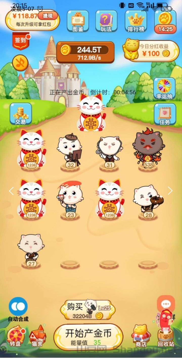 我有招财猫小游戏首码:合成38级永久分红90%广告收入秒提