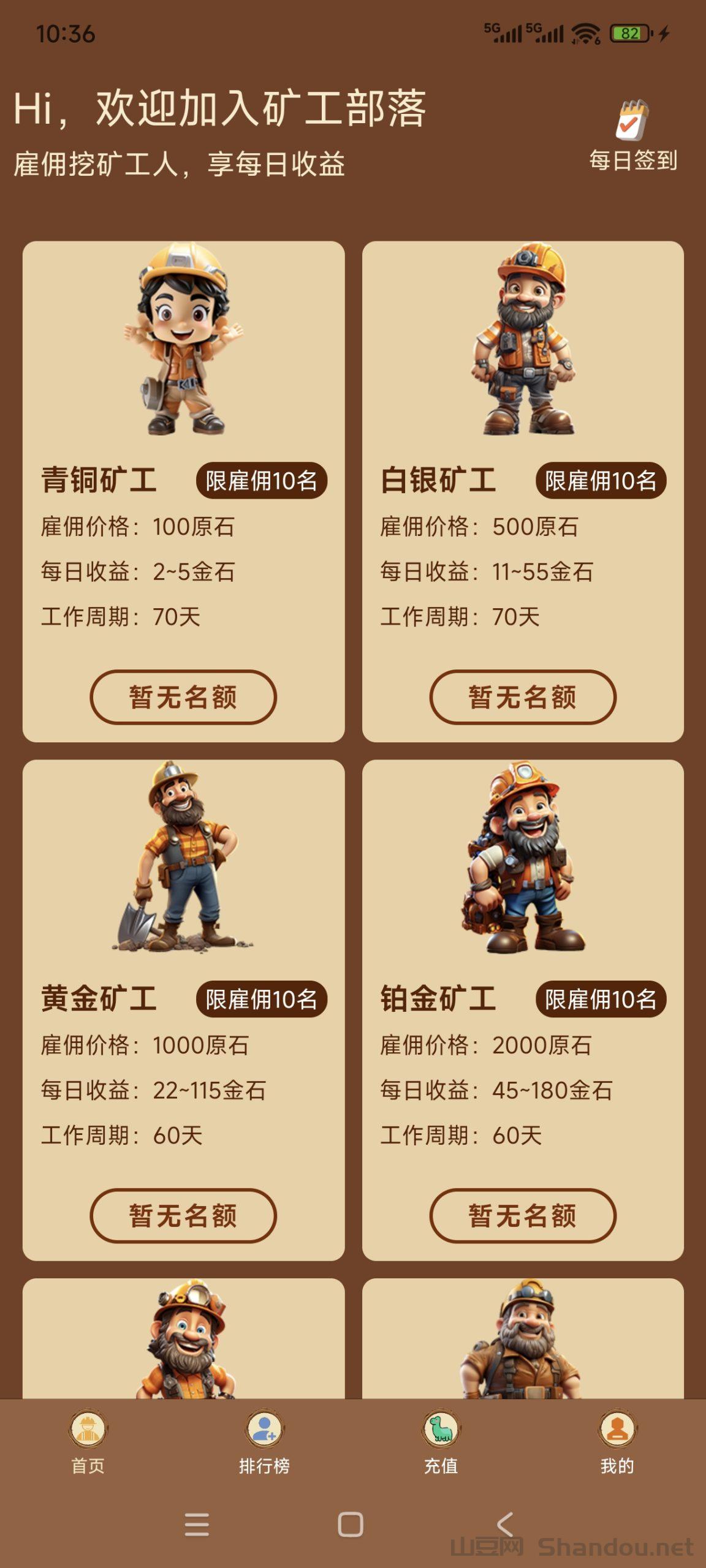 黄金矿工,不用实名,每日无广告签到得5个原石,原石可用来购买矿工,每日可产出5个金石,白银级旷工每日查出50金石,黄金矿工每天产出150……等级越高产出越好,金石兜底回收1米1个,可直接提米。