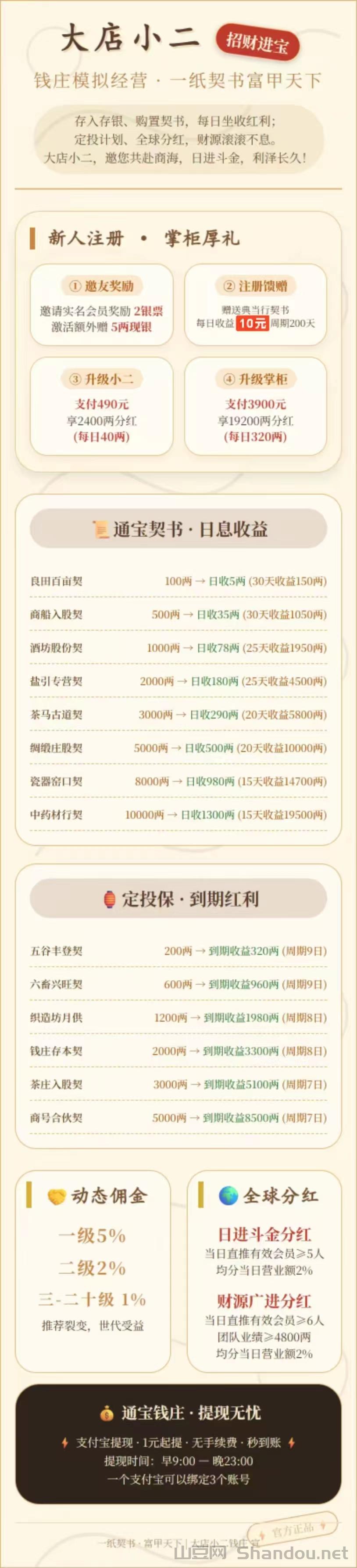 首码正式启航《大店小二》注册送典当行每天收益10银票,每邀请一人注册得2银票,升级店小二每天粉紅40元,升级掌柜每天分紅320元!